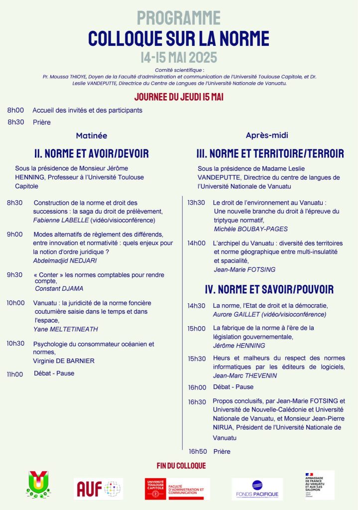 Les 14 et 15 mai 2025 se tient au Vanuatu un colloque intitulé « La Norme ». Ce colloque international, inter/transdisciplinaire et interuniversitaire est organisé par la Faculté d’Administration et Communication de l’université Toulouse Capitole et l’Université Nationale de Vanuatu, en partenariat avec l’Agence Universitaire de la Francophonie (AUF), le Fonds Pacifique et l’Ambassade de + Lire la suite